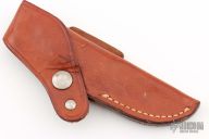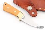 This Pack Rat I by Al Mar features a mirror polished drop point blade with notched thumbrest, .114" blade stock and .853" blade depth, full tapered tang construction. The handle has brass bolsters and yellow paper micarta scales with brass pins and lanyard hole. Comes with a brown leather sheath. Has some light scratches, otherwise excellent condition.