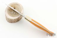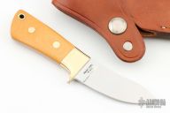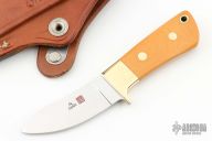 This Pack Rat II by Al Mar features a mirror polished upswept blade with notched thumbrest, .117" blade stock and .863" blade depth, full tapered tang construction. The handle has brass bolsters and yellow paper micarta scales with brass pins and lanyard hole. Comes with a brown leather sheath. Has some light scratches, otherwise excellent condition.