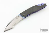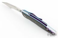 This liner lock folder from Mike Franklin features a chisel grind blade with serrations and a single thumbstud with inlay.  Handle has an anodized and jeweled titanium frame with carbon fiber scales. Tip down, matching titanium clip, stainless steel backspacer. Excellent condition. "4 02-A" on the blade.
