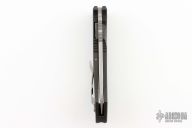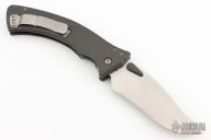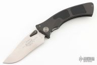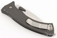 This Amphibian M/A by Microtech #1550 and dated 08/2002 has a stonewashed blade with notched thumb rest and dual thumb studs. Handle has a black anodized aluminum frame with non-slip inserts, lanyard pin, tip up bead blasted stainless steel clip. Comes with original box, sheath and papers.  Has some scuffs, otherwise excellent condition.