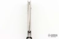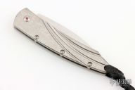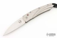 This side opening auto by William Henry Fine Knives features a hand rub satin finished blade. The handle has a stippled titanium frame with push button, push button and pivot have a sapphire stone set in a gold bezel. Fast action and strong lock up. Includes original box, COA and leather sheath. Excellent Condition.