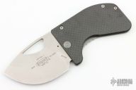 This Option II folder by Microtech features a stonewashed plain edge blade with notched thumbrest and a thumbhole. The handle is stainless steel with frame lock closure on one side and carbon fiber on the other. Dated 08/2001 and S/N 0546. Has light scuffs, otherwise excellent condition. Comes with original box and papers.