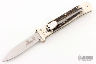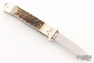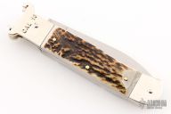 This leverlock auto by Hubertus features a high polished tumbled blade, nickel silver double bolsters, stag scales, nickel silver liners and brass pins. Opens with a nice snap. Very fast opening. Comes with original box. Excellent Condition.
