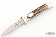 This leverlock auto by Hubertus features a high polished tumbled blade, nickel silver double bolsters, stag scales, nickel silver liners and brass pins. Opens with a nice snap. Very fast opening. Comes with original box. Excellent Condition.