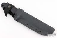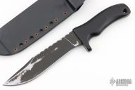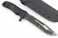 This SEAL ATAK Series A by Mad Dog Knives features a black coated clip point blade with fileworked spine, .250" blade stock and 1.494" blade depth, hidden tang construction. The handle is made of black G-10 with lanyard hole. Comes with a kydex sheath with belt loop. Has scratches, wear on the finish, otherwise good condition. #A634 The Series A was the first run made for the civilian market after the original ATAK was accepted for the SEAL teams. Blade Steel: Starrett 496-01 High Carbon Tool Steel