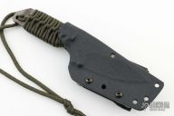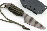 This SA by Strider Knives has a tiger stripe finish blade and green cord wrap handle, .251" blade thickness and 1.304" blade depth. Notches on thumbrest and rear of handle. Includes a kydex sheath. Sheathing scuffs are visible on the blade otherwise the knife is in excellent condition.