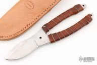 A really neat all purpose tool which when carried in the sheath looks like a pair of shears. The handle is wrapped in leather and provides a secure and comfortable grip. False top edge. Full tang. Notched thumbrest. Thong holes. .254" Spine thickness with a maximum blade depth of 1.252". Quite unique. Comes with a brown leather sheath. Has some scratches, otherwise excellent condition.