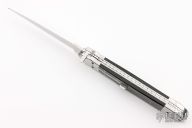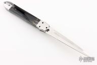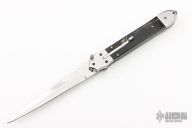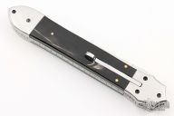 This Auto by Agasi Hambartsumian of Armenian Doctor Knives features a mirror polished blade with false top edge. The handle has stainless steel bolsters and liners, buffalo horn scales with brass pins, fileworked stainless steel backspacer. New from maker. Comes with a hand tooled brown leather sheath.