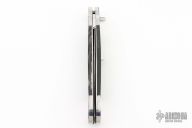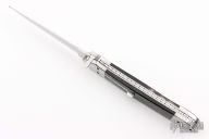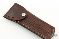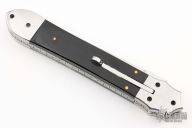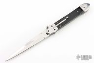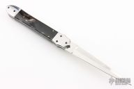 This Auto by Agasi Hambartsumian of Armenian Doctor Knives features a mirror polished blade with false top edge. The handle has stainless steel bolsters and liners, buffalo horn scales with brass pins, fileworked stainless steel backspacer. New from maker. Comes with a hand tooled brown leather sheath.