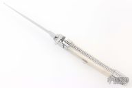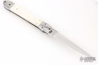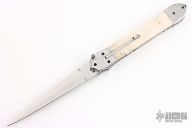 This Auto by Agasi Hambartsumian of Armenian Doctor Knives features a mirror polished blade with false top edge. The handle has stainless steel bolsters and liners, white bone scales with brass pins, fileworked stainless steel backspacer. New from maker. Comes with a hand tooled brown leather sheath.