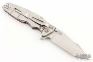 This Eklipse Tri-Way by Hinderer Knives features a stonewashed harpoon tanto blade with dual thumbstuds, flipper and notched thumbrest. The handle has a titanium frame and liner with a textured G-10 scale and tumbled titanium clip and hardware. Nice detent, lockup and blade seating. Comes with original box, card and extra hardware. Excellent condition.