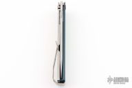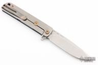 Stonewashed blade, and black aluminum and stonewashed titanium frame, tip up reversible stainless steel clip. Comes with original zippered case, box and papers. Excellent condition.