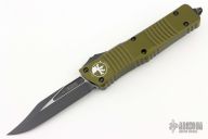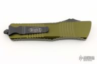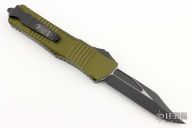 This Combat Troodon OTF automatic from Microtech features a black bowie blade with a standard edge and a green aluminum frame. Stainless steel clip. Glass breaker. Comes with original box and papers. S/N 40587 and dated 10/2022. Excellent condition.