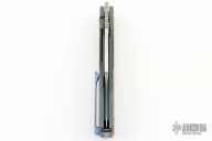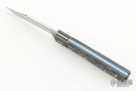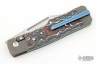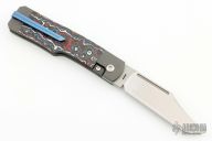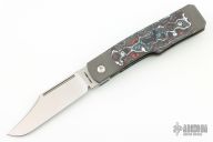 This Gunslinger Jack is a gunstock front flipper model by Jack Wolf Knives featuring a satin finished clip point blade with fuller. The handle has integral bead blast finish pinched and fluted titanium front and rear bolsters and liners, Fat Carbon inlays, anodize finish backspacer, and titanium tip up clip. Has filler tab for clip. Comes with box, metallic tube with J. Gonzo artwork, sticker, pog, and microfiber cleaning cloth. New from maker!