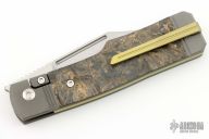 This Gunslinger Jack is a gunstock front flipper model by Jack Wolf Knives featuring a satin finished clip point blade with fuller. The handle has integral bead blast finish pinched and fluted titanium front and rear bolsters and liners, Fat Carbon inlays, anodize finish backspacer, and titanium tip up clip. Has filler tab for clip. Comes with box, metallic tube with J. Gonzo artwork, sticker, pog, and microfiber cleaning cloth. New from maker!
