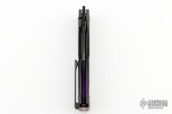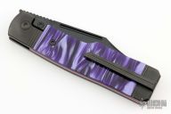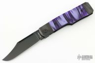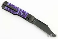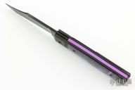 This Gunslinger Jack is a gunstock front flipper model by Jack Wolf Knives featuring a DLC finished clip point blade with fuller. The handle has integral DLC finish pinched and fluted titanium front and rear bolsters and liners, Kirinite Cosmic Purple inlays, anodize finish backspacer, and titanium tip up clip. Has filler tab for clip. Comes with box, metallic tube with J. Gonzo artwork, sticker, pog, and microfiber cleaning cloth. New from maker!