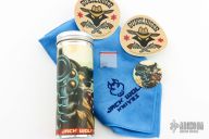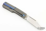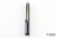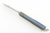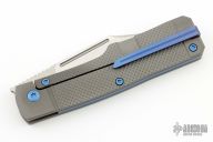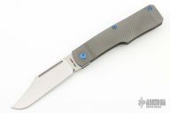 This Gunslinger Jack is a gunstock front flipper model by Jack Wolf Knives featuring a satin finished clip point blade with fuller. The handle has integral bead blast finish pinched and fluted titanium front and rear bolsters, checkered titanium body, anodize finish backspacer, and titanium tip up clip. Has filler tab for clip. Comes with box, metallic tube with J. Gonzo artwork, sticker, pog, and microfiber cleaning cloth. New from maker!