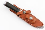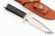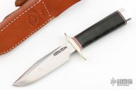 This is a miniature Model 1 - with all the features of the famous WWII full size Model 1. Stainless steel blade with top edge sharpened approximately 1 3/4 inches back from the tip, .166" blade stock and .833" blade depth, hidden tang construction. The handle has a nickel silver double guard, duralumin butt, and a black linen micarta grip with red/white/blue spacers. Comes with a brown leather sheath. In addition, the knife is authenticated by a coded transponder which cannot be altered. The transponder is inserted into the handle during construction with an encoded serial number matching the etched number on the blade. Only 1500 made. Serial number 445. Excellent condition.