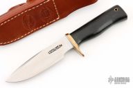 This Miniature model 28 features a satin finished drop point blade with notched thumbrest, .178" blade stock and 885" blade depth, full tang construction. The handle has a brass guard, black micarta grip and lanyard hole. Each miniature Randall model has a transponder in the handle matching the serial number of the knife, in this case "RKS 618". Comes with brown leather sheath. Excellent condition.