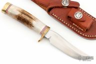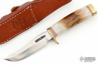 This Miniature Model 3 Hunter by Randall features a stainless steel blade with false top edge, .168" blade stock and .816" blade depth, hidden tang construction. The handle has a brass guard and butt, and stag grip with red/white/blue spacers. This knife is part of a limited edition and is numbered 403. Comes with a brown leather sheath. Excellent condition.