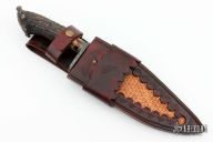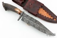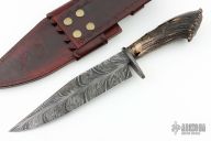This Fighter by Abril Knives features a Feather Damascus blade with false top edge, .191" blade stock and 1.991" blade depth, hidden tang construction. The handle has a Damascus guard, spacer, and crown stag grip with single stainless pin. Comes with hand-tooled leather sheath. Excellent work. New from maker!