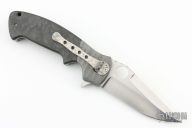 This Kasper features a satin finished blade with fileworked spine and flipper, thumbhole. The handle has dovetailed Damacus bolsters, marble carbon fiber scales, titanium liners with jeweled interiors and fileworked edges, carbon fiber backspacer, tip down jeweled titanium clip with fileworked edges. Nice detent, lockup and blade seating. Excellent condition.