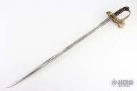 Civil War Model 1850 Non-Regulation Sword. The ricasso is marked "W. Clauberg Solingen" with a standing knight, and the spine has "Iron Proof" on it. The brass guard, grip, and pommel are a little loose. The sharkskin grip and twisted wire wrap is complete. Etched blade with patina. Has some scuffs and scratches, great condition. MFG 1862.