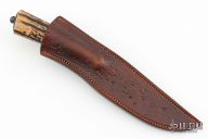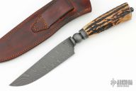 This Integral Hunter by Master Smith Erik McCright features a Twist Damascus (1080 and 15n20) blade with integral bolsters/guard, .175" blade stock and 1.159" blade stock, hidden tang construction. The handle has a stag grip, textured and darkened mild steel butt plate and spacer. Comes with a brown leather sheath with belt loop. New from maker at the 2024 Blade Show Texas. Comes with a zippered case and COA dated 2-17-24.