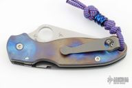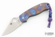 This Para 3 by Spyderco features a tumble finished clip point blade with thumb hole and notched thumbrest. S45VN Blade Steel. The handle has custom textured and anodized titanium scales over nested steel liner and stand-offs. Tip up Lynch clip. Includes original box, camo G-10 scales, clip, original clip, and paperwork. Excellent condition.
