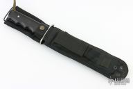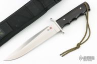 This Model 4008-B SF-SOG Special OPS knife from Al Mar features a satin finish, clip point bowie style blade with false top edge, .230" blade stock and 1.420" blade depth, full tang construction. The handle is comprised of stainless steel guard and black paper micarta handles with lanyard tube in pommel. Excellent condition. Includes a nylon sheath.