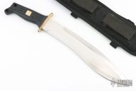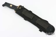 This Pathfinder Kukri from Al Mar Knives features a kukri style satin finished blade with a sharpened top edge, .178" blade stock and 2.375" blade depth, hidden tang construction. The handle is comprised of a brass guard and grooved polymer handle over hidden tang construction. Gold Al Mar "chop" in handle. Has some light sheathing marks, otherwise excellent condition. Comes with original nylon sheath.