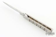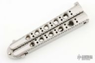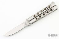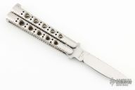 This early balisong from Pacific Cutlery features a Jody Samson hand ground blade with satin finish and fileworked spine. The handles are stainless steel with hole pattern and fileworked edges. Has some scratches, otherwise good condition.