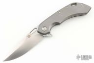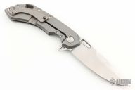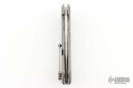 This Wayfarer 247 from Olamic Cutlery features a satin finished blade with swedge, thumbhole, notched thumb rest and flipper. The titanium handle scales are matte finished titanium with a matching pocket clip is positioned for tip up carry with a ceramic ball inlay, floating titanium backspacer. The Wayfarer 247 is very comfortable in the hand and flips well with no wrist action needed. Blade is centered when closed and locks up with no play. T050 on the backspacer. Excellent condition. Comes with zippered case and COA.