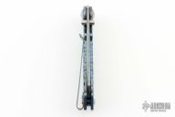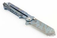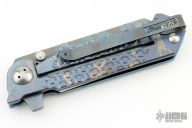 This framelock flipper (please let us know if you know who made this) features a chisel ground anodized titanium blade with carbidized edge, dual thumbstuds and a flipper. The handle has a milled and anodized titanium frame with matching tip up clip. Nice lockup and blade seating. Has a few light scuffs, otherwise excellent condition.