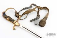 Having 27-inch blade with Carl Eickhorn “seated squirrel” mark on ricasso, gilt brass hilt retaining leather buffer pad, backstrap and pommel with wire-wrapped grip; scabbard having black finish and single suspension ring.