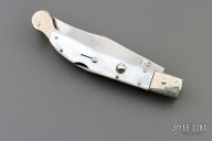 Angelo Campolin Sr. was born in 1923 in Maniago, Italy. He worked on perfecting his knife making skills before WWII and at this time made his first switchblades. After the war, in 1947 he started his company and made 30 stilettos with the marking “Angelo Campolin”. In the 1970’s Angelo’s son Gianni started to work in the company and they were specializing in folding hunting knives and also manual folding stilettos for the Robert Klaas company in Solingen Germany with their Kissing Cranes mark. In 2002 American switchblade collectors Dan Fuller, Brad West, and Tim Zinser were visiting Maniago and enjoying a few glasses of wine in a bar with Angelo Jr. and Gianni. The discussion was about a new name for some knife projects they wanted to pursue. It was Brad West that suggested the tang stamp should be AGA, for Angelo, Gianni, Angelo, thus representing three generations in the knife making business. The Campolins liked it and it stuck. In the beginning it was just a few items, but grew to the point where now there are 12 models and different scale options. The goal has been to offer quality switchblades using the old methods and traditions. Being a collector himself, Angelo Jr. knows what others like. The company headquarters has moved to Austria with production still in the original Maniago shop, as well as the others in Maniago that produce the knives for A.G.A. Campolin.