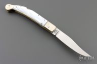 This Sahara lockback auto by AGA Campolin features a polished blade, nickle silver bolster and pearlex scales, brass liners. Nice function, strong firing and lock up. Has a few light scratches, otherwise excellent condition. They no longer make this knife anymore.
