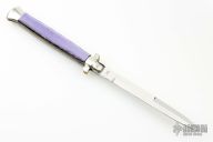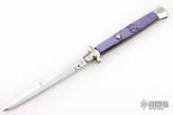 This large Swivel Bolster from A.G.A. Campolin features a mirror finished spear point blade with false top edge. The handle has nickel silver bolsters and pommel with purple pearlex scales over brass d-stamp liners and stainless steel backspacer. Has some light scratches, otherwise excellent condition. This knife was made back in the 1980s
