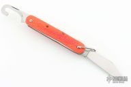 This knife by Camillus features a clip point blade. The handle has orange jigged scales, stainless steel liners and backspacer. Has Safety. Has some light scratches, otherwise the knife is in excellent condition.