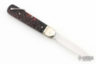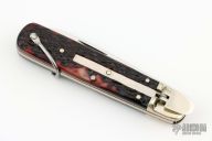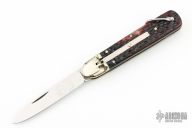 This Boker Leverlock features a drop point blade. The handle is comprised of nickel silver bolsters and faux jigged bone scales over brass liners and stainless steel backspring. Has a little scratches, otherwise excellent condition.
