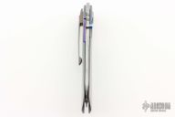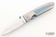 This Linerlock by Michael Walker features a polished Damascus blade with a single anodized titanium thumbstud and a notched thumbrest. The handle has anodized titanium scales with a clever pattern and contouring, anodized titanium liner, Damascus backspacer, tip down titanium clip. Nice lockup, detent and blade seating. Comes with a zippered pouch. A-Side of the blade is marked "Walker". Excellent condition.