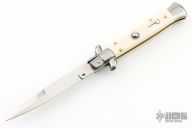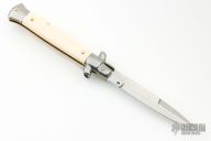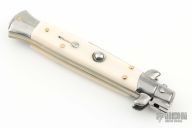 This Swivel Bolster features a mirror polished flat ground 4mm blade. The handle has stainless bolsters, front and rear, imitation ivory scales, brass liners, stainless spring. Excellent condition.