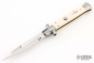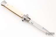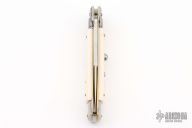 This Swivel Bolster features a mirror polished bayonet ground 4mm blade. The handle has stainless bolsters, front and rear, imitation ivory scales, brass liners, stainless spring. Excellent condition.