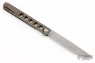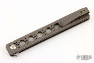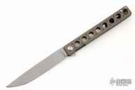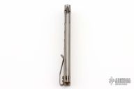 This Large Miscreant by Brad Zinker features a stonewashed drop point blade with notched thumbrest and flipper. The handle has a tumbled and anodized titanium frame with matching tip up clip. Rides on bearings, nice detent, lockup and blade seating. Comes with a zippered case. Excellent condition.