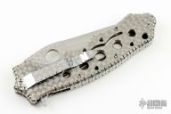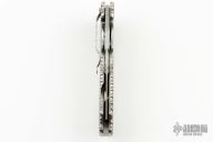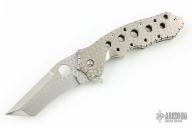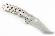 This Triumph flipper by Crawford Knives features a satin finish tanto recurve blade with jeweled flats and a jeweled titanium handle with file work along the edges and on blade spine. The stainless steel tip down clip and backspacer are also jeweled and fileworked. False top edge. Comfortable contoured handle. Smooth action with a nice detent, lockup and blade seating. Excellent work. comes with a zippered case. Excellent condition.