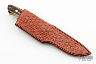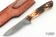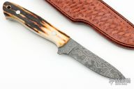 This knife by DE Freidly features a Mike Norris Stainless Damascus blade with notched thumbrest, .145" blade stock and .868" blade depth, full tapered tang construction with stag scales and stainless steel pins. Comes with a hand tooled brown leather sheath. Excellent condition.