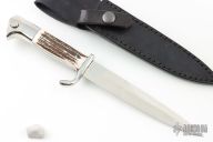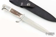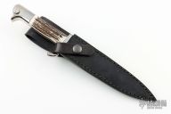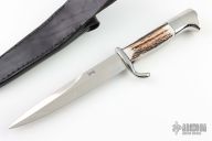 This Boot Knife by Anton Wingen Jr features a mirror finished blade with unsharpened edges, .215" blade stock and .913" blade depth, hidden tang construction. The handle has a stainelss steel frame with stag scales and nickel silver pins. Comes with a black leather sheath. Has some light scratches, otherwise excellent condition.