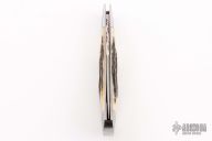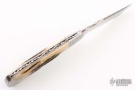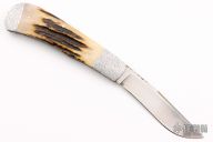 This Trapper by Rusty Preston features a hand rub satin finished recurve blade with nail nick and fileworked blade spine. The handle has stainless steel bolsters, front and rear, stainless steel liners, stag covers, stainless steel spring with vine patterned filework. Has half-stop, flush in all positions. Excellent Condition.