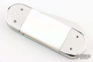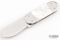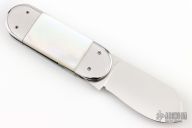 This linerlock by Steve Hostetler features a mirror polished blade. The handle has polished stainless steel bolsters, mother of pearl scales, titanium liners, polished stainless steel backspacer. Nice detent, lockup and blade seating. Comes with a nylon zippered case. Has a few light scratches, otherwise excellent condition.