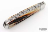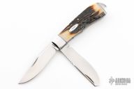 This trapper by Rusty Preston features two hand rub satin finished blades with fileworked spines and nail nicks. The handle has threaded stainless steel bolsters, stag scales, stainless steel liners and fileworked stainless steel spings. Has half-stops, flush in all positions. Excellent condition.